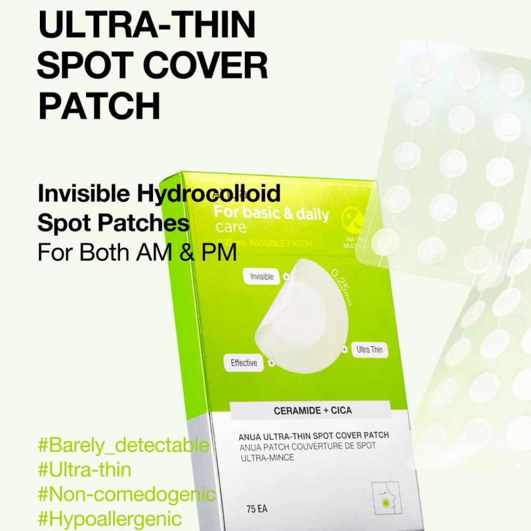 Anua – Ultra-Thin Spot Cover Patch are matte patches blend naturally with skin, suitable for AM/PM use, and provide seamless coverage under makeup. Hydrocolloid extracts oil and residue from the spot, while Centella helps soothe redness caused by dryness and Ceramides help maintain the skin’s moisture barrier for a clearer appearance.